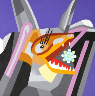 „Fledermaus schluckt und spuckt“, 2020WVZ-2020-02 Jahr: 2020 Maße: 65 x 65 cm Technik: Acryl auf Leinwand Standort: Privatbesitz
