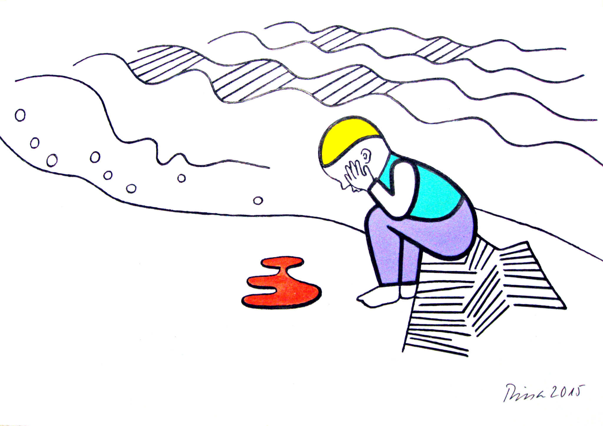 Tusche und Gouache auf Druckzeichnung auf Papier