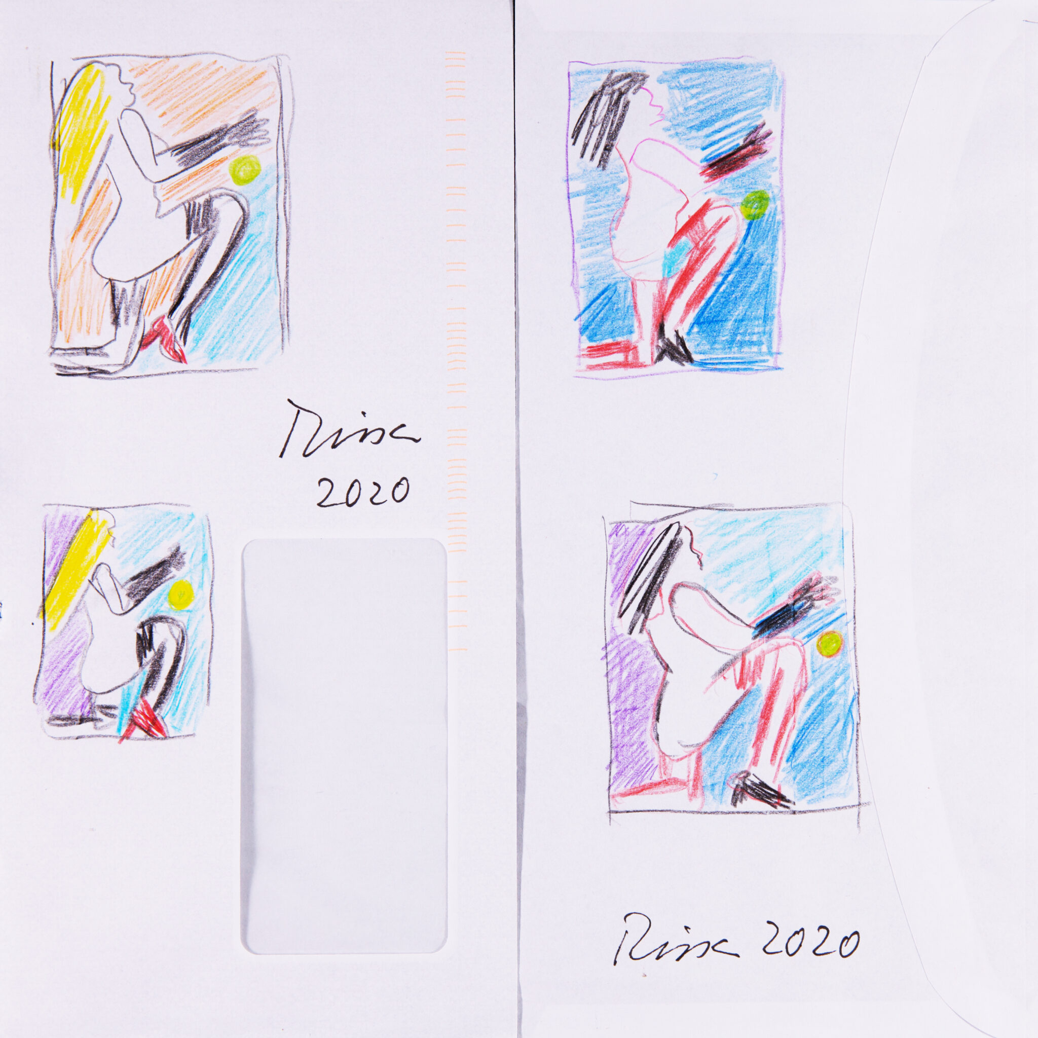 4 Farbskizzen, datiert und signiert auf den beiden Seiten eines Briefcouverts.